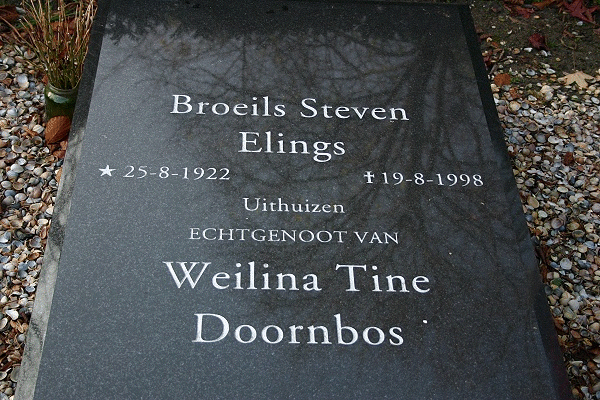Broeils Steven ELINGS geb Uithuizen 25.08.1922 ber landbouwer op Lumaheerd overl Uithuizen 19.08.1998 begr Uithuizen tr 1953 Weilina Tine DOORNBOS geb vader: moeder: ber overl begr Uithuizen