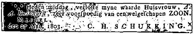 Johanna Schukking, geb. Meppel 7 Feb. 1801, overl Zutfen 4 Oct.