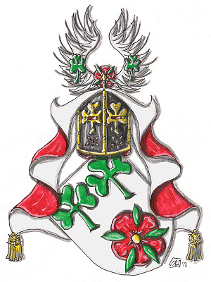 klaverbladeren en een rode roos, goud geknopt en groen gepunt. Helm: aanziende pothelm