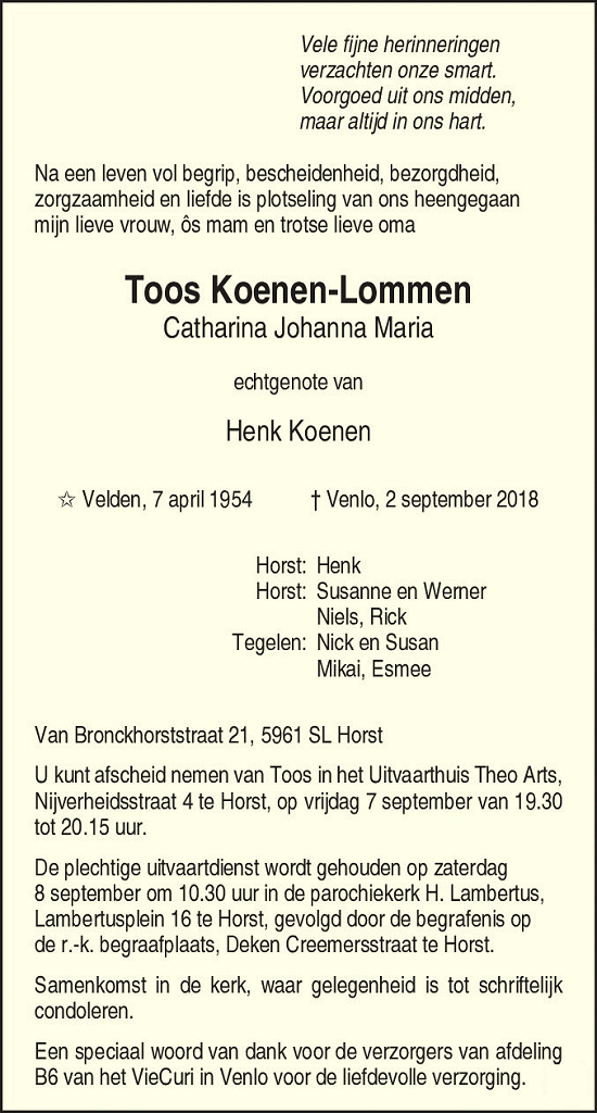 - https://www.mensenlinq.nl/overlijdensberichten/catharina-johanna-maria-toos-koenen-lommen-7965892