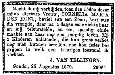 Cornelia Maria den HOET (HOED) geb Gouda 1853 vader: Pieter den Hoet (Hoed) moeder: Cornelia Maria van Draanen ber overl Gouda 17.08.1879 tr Gouda 22.11.1876 akte nr 167 Jan van TELLINGEN geb Zeist 1853 ber overl