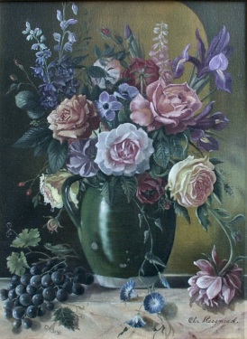 namaak van bloemstillevens. Hij koos en kiest zijn eigen arrangementen. Af en toe waagt de schilder zich