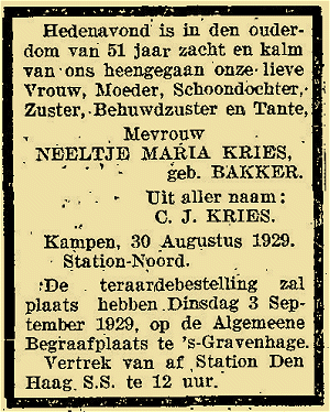 Neeltje Maria BAKKER geb Petten 27.01.1878 vader: Pieter Bakker (ber opzichter van Drechterland) moeder: Cornelia van der Velde ber overl Kampen 30.08.1929 Station Noord begr ’s Gravenhage 03.09.1929 Algemene Begraafplaats tr Enkhuizen 21.08.1902 akte nr 38 Conradijn Jacobus KRIES geb Bovenkarspel 12.05.1879 ber spoorbeambte overl