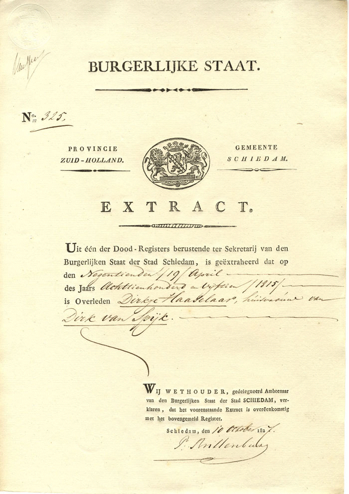 Dirkje HAASELAAR (HAZELAAR) geb vader: moeder: ber huisvrouw overl Schiedam 19.04.1815 tr 1 Schiedam? Dirk van SPIJK ged Oud Beijerland 22.09.1771 ber tuinier overl Schiedam 26.01.1846