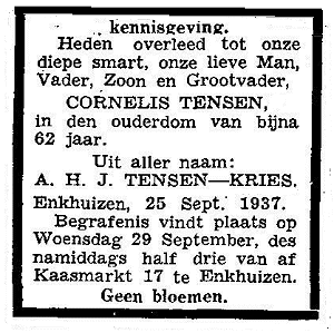Cornelis TENSEN geb Enkhuizen 1875 ber koopman overl Enkhuizen 25.09.1937 begr Enkhuizen 29.09.1937 tr Enkhuizen 29.11.1906 akte nr 64 Adriana Hubertina Johanna KRIES geb Enkhuizen 1883 ber overl