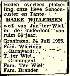 Haike WILLEMSEN geb Slochteren 19.08.1890 vader: Klaas Willemsen moeder: Geertje Wold ber dienstmeid overl Groningen 24.07.1955 begr Overschild tr Slochteren 21.06.1911 akte nr 66 * Jan ter WIEL geb Garnwerd gemeente Ezinge 03.07.1875 aangiftedatum Ezinge 3 juli 1875 akte nr 47 ber schipper overl Overschild 13.03.1954 begr Overschild 17.03.1954